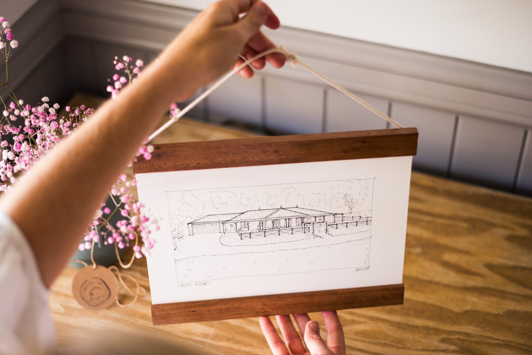 You gently lay your artwork within the timber bar secure using a soft cotton cord. Sustainably framing, allowing you to rotate your artwork within the one frame, in any room.. Let the magic happen.